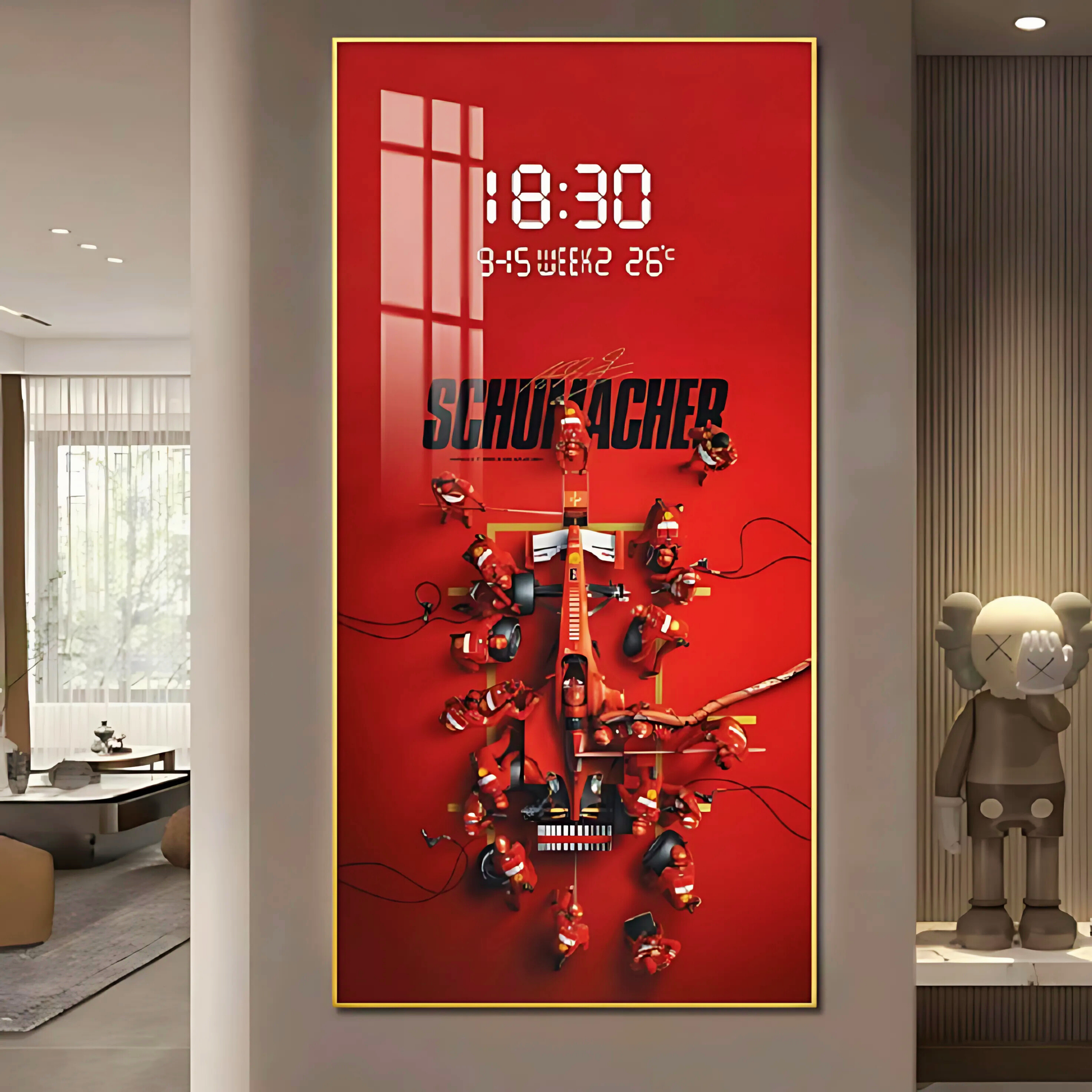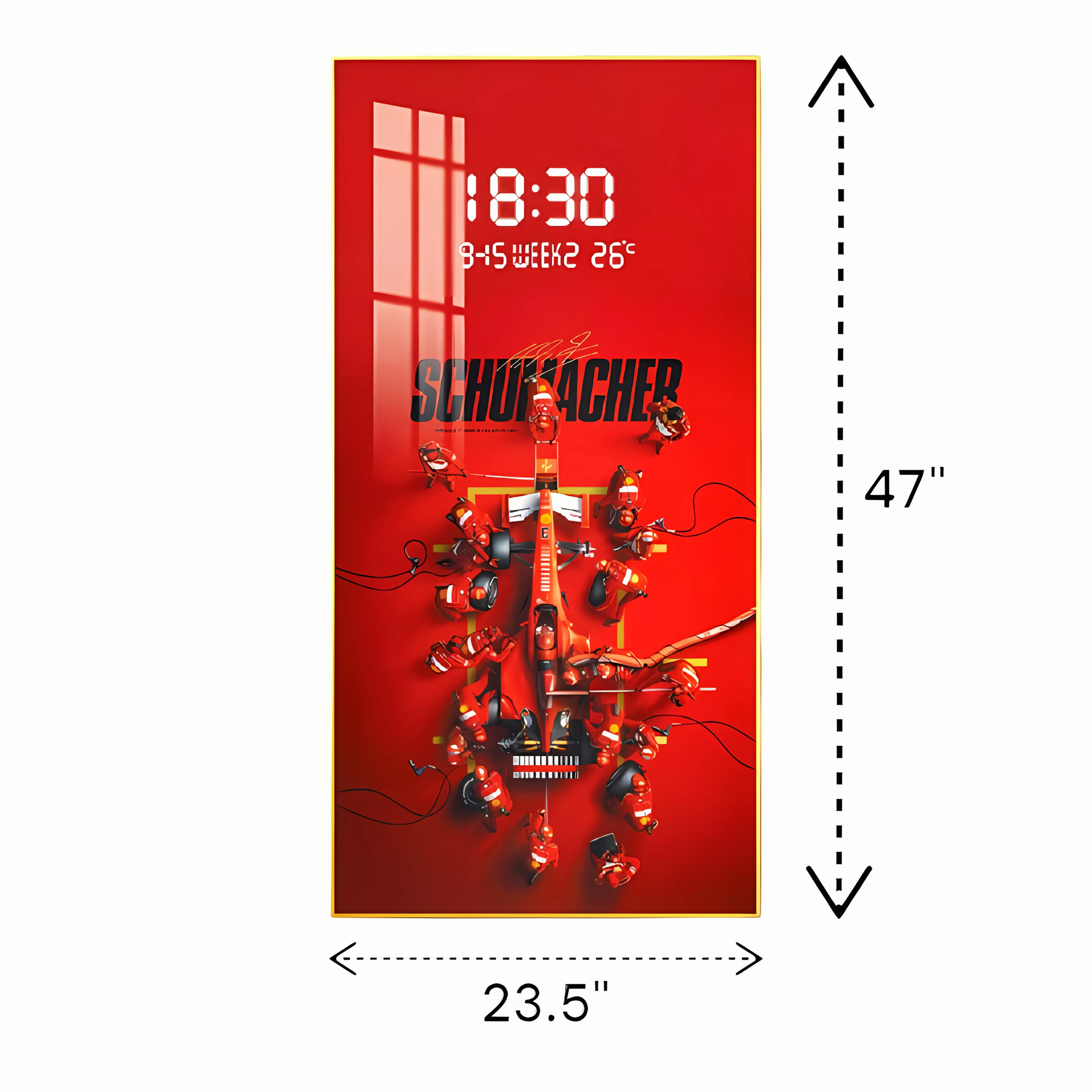 Ignite the thrill of speed and precision in your Bengaluru home or office with our exhilarating Schumacher – F1 – Digital Clock. More than just a time-teller, this dynamic piece is designed to celebrate the legendary racing prowess of Michael Schumacher and the electrifying world of Formula 1, bringing the essence of victory to your space.