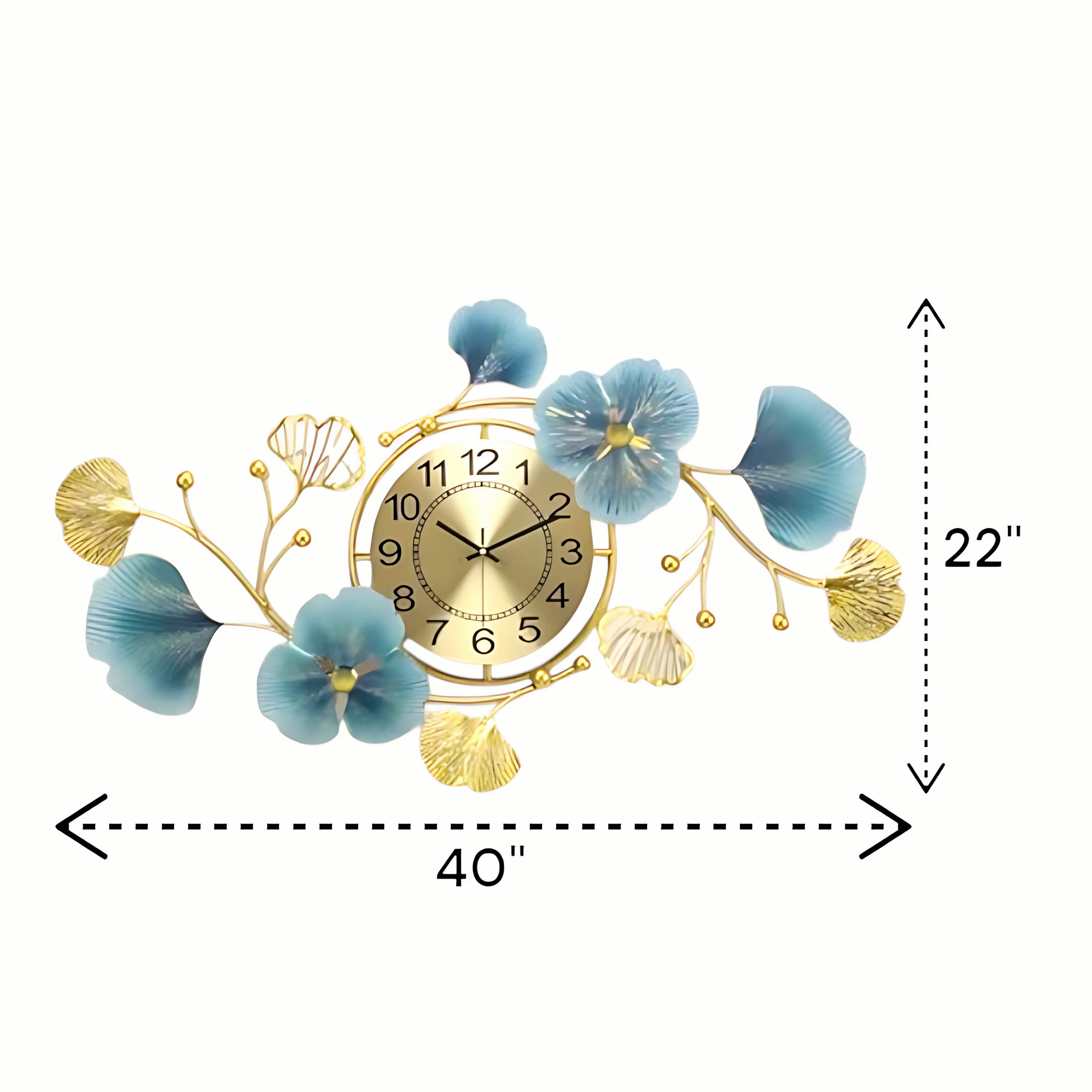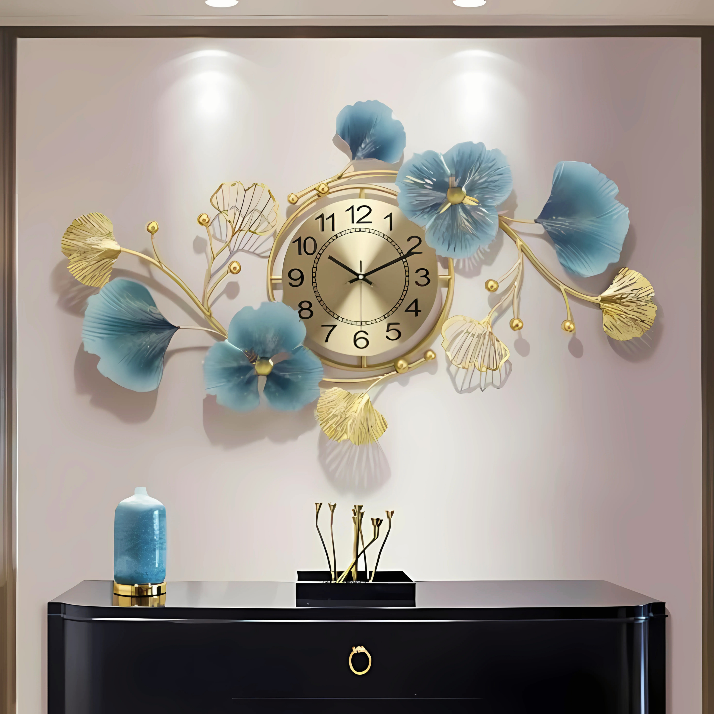 This unique wall clock features an artistic design that embodies the essence of “flowing time” – whether through elegant, undulating lines, subtle wave-like patterns, or a fluid interplay of its components. The design is brought to life by a harmonious blend of calming blues and radiant golden accents, creating a visually rich and sophisticated aesthetic that evokes tranquility and continuous progression.